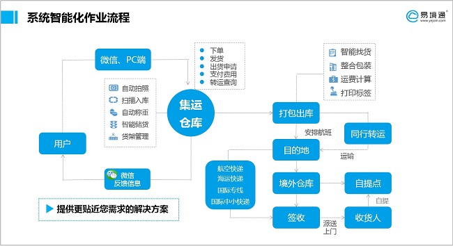 系統(tǒng)采用智能化操作流程,從客戶下單到掃描入庫(kù)、上架找貨、打包計(jì)費(fèi)以及付款出倉(cāng)和物流軌跡信息等;