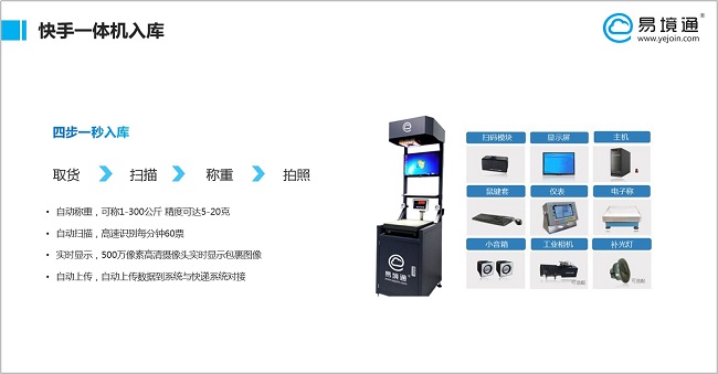 快手一體機(jī)入庫(kù),實(shí)現(xiàn)自動(dòng)稱重、自動(dòng)掃描,實(shí)時(shí)顯示,自動(dòng)上傳將取貨、掃描、稱重、拍照一秒完成。