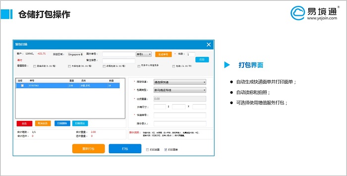 還可以用打包功能對包裹打包,可自動打印面單還有拍照,以及稱重。