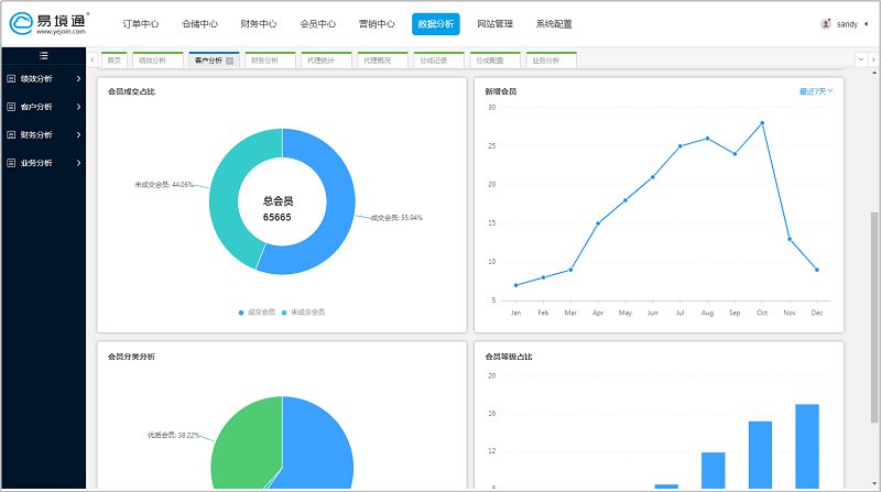 可視化分析客戶的成交占比,新增會(huì)員趨勢(shì),會(huì)員分析,等級(jí)分析等等。
