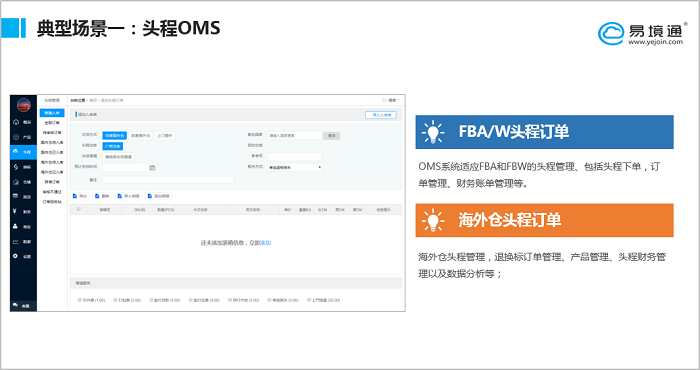 易境通WMS系統(tǒng)包含從國(guó)內(nèi)頭程發(fā)貨至尾程派送、以及退貨換標(biāo)的處理,主要功能包括OMS訂單管理、FBA/W頭程、一件代發(fā)、FBA中轉(zhuǎn)、退貨換標(biāo)等。