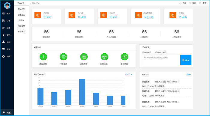 系統(tǒng)包括快遞面單打印、訂單批量導入,API下單,上門提貨、自送貨、貨物入庫管理、報關資料管理、COD貨到付款管理、快遞問題件處理、轉單查詢等功能。
