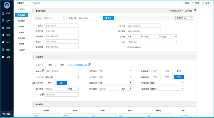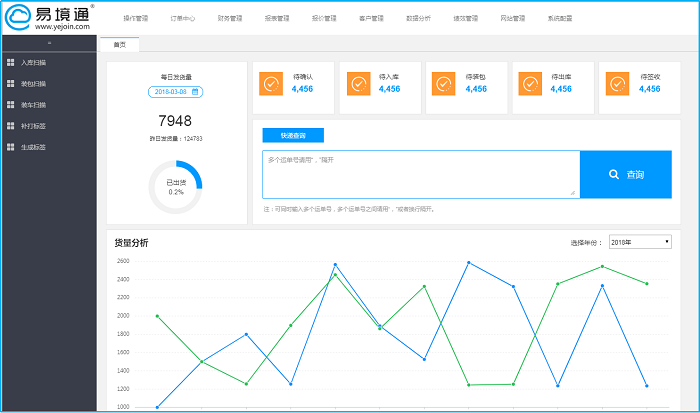 管理端主要提供管理操作、包括操作管理(出入庫操作)、訂單管理(訂單錄入、訂單管理、物流軌跡管理、問題件管理)、財務管理(客戶結算、站點結算、服務商結算)、報價管理、客戶管理等。