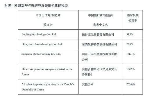 此前,歐盟委員會(huì)發(fā)布公告稱,對(duì)原產(chǎn)于中國(guó)的赤蘚糖醇作出反傾銷初裁,初步裁定對(duì)涉案產(chǎn)品征收31.9%~235.6%的臨時(shí)反傾銷稅(具體看征稅表)。同時(shí),計(jì)劃對(duì)我國(guó)出口的生物柴油征收12.8%至36.4%的臨時(shí)反傾銷稅。