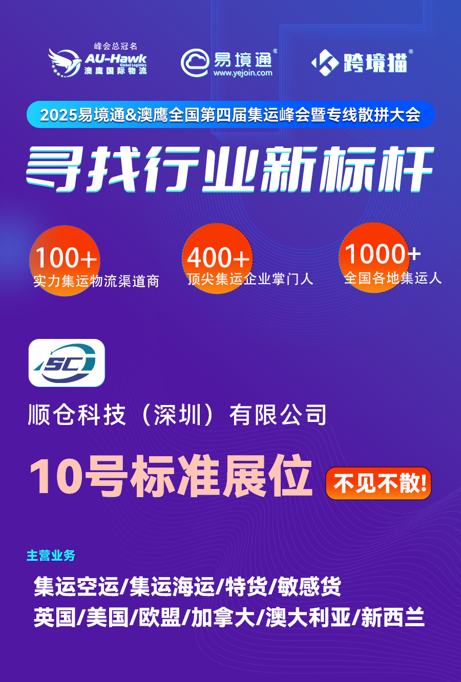 2025集運(yùn)怎么卷?2月20日,就在深圳,2025易境通&澳鷹全國(guó)第四屆集運(yùn)峰會(huì)暨專線散拼大會(huì)告訴你!澳洲、歐美、東南亞、日韓、加拿大集運(yùn)資源對(duì)接、教你用差異化打法躺贏市場(chǎng)!我們誠(chéng)摯地期待您的到來(lái),共探行業(yè)發(fā)展新篇章!