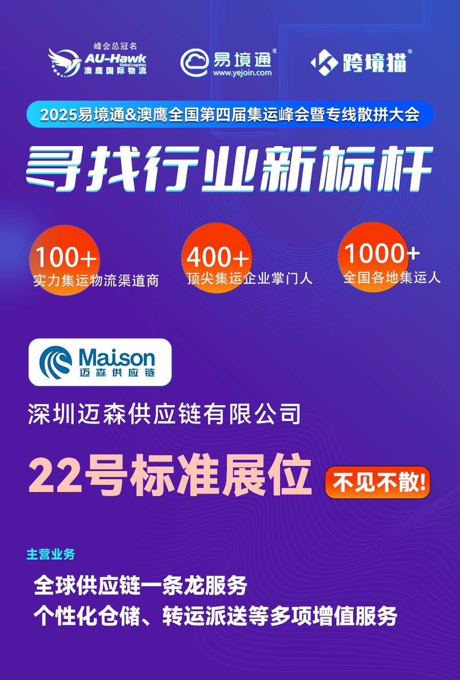 此刻,正是行動(dòng)之時(shí)!2025集運(yùn)人年度盛會(huì)就在深圳恭候您的到來!邁森供應(yīng)鏈在22號(hào)標(biāo)準(zhǔn)展位,熱切期待您的光臨!讓我們共謀合作新機(jī)遇,攜手開創(chuàng)集運(yùn)行業(yè)的輝煌未來。2月20日,深圳相聚,一同啟程,共赴這場(chǎng)集運(yùn)的璀璨盛宴!