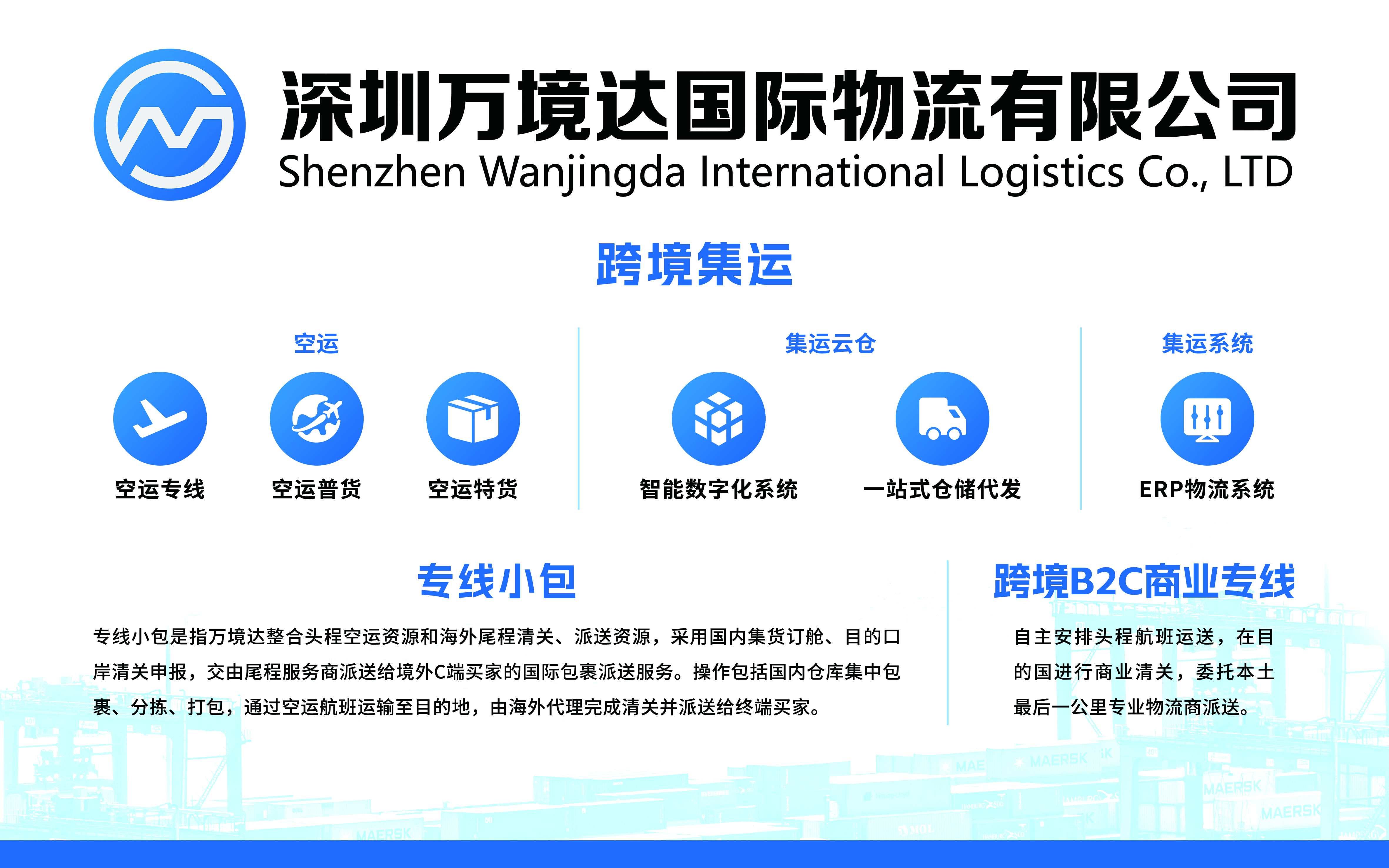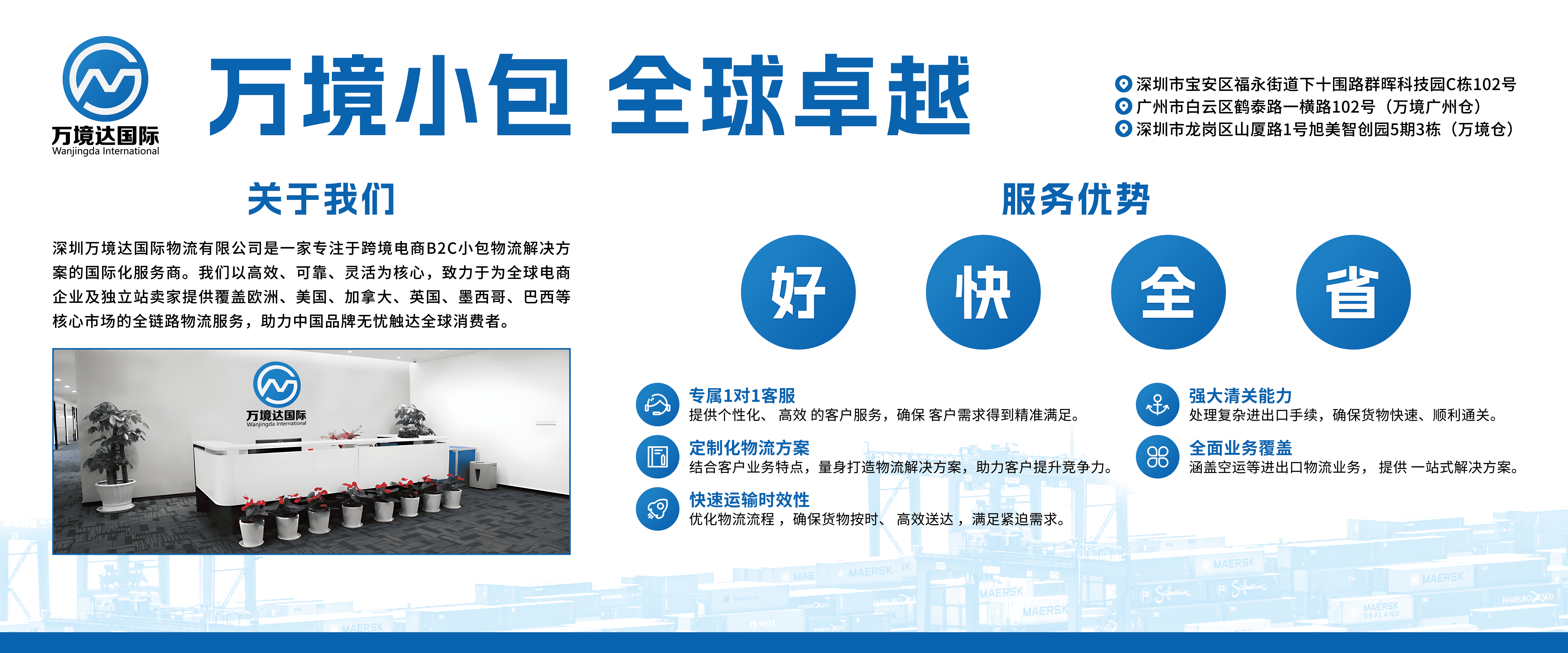 深圳萬境達(dá)國際物流有限公司是一家專注于跨境電商B2C小包物流解決方案的國際化服務(wù)商,以高效、可靠、靈活為核心,致力于為全球電商企業(yè)及獨(dú)立站賣家提供覆蓋歐洲、美國、加拿大、英國、墨西哥、巴西等核心市場的全鏈路物流服務(wù),助力中國品牌無憂觸達(dá)全球消費(fèi)者。