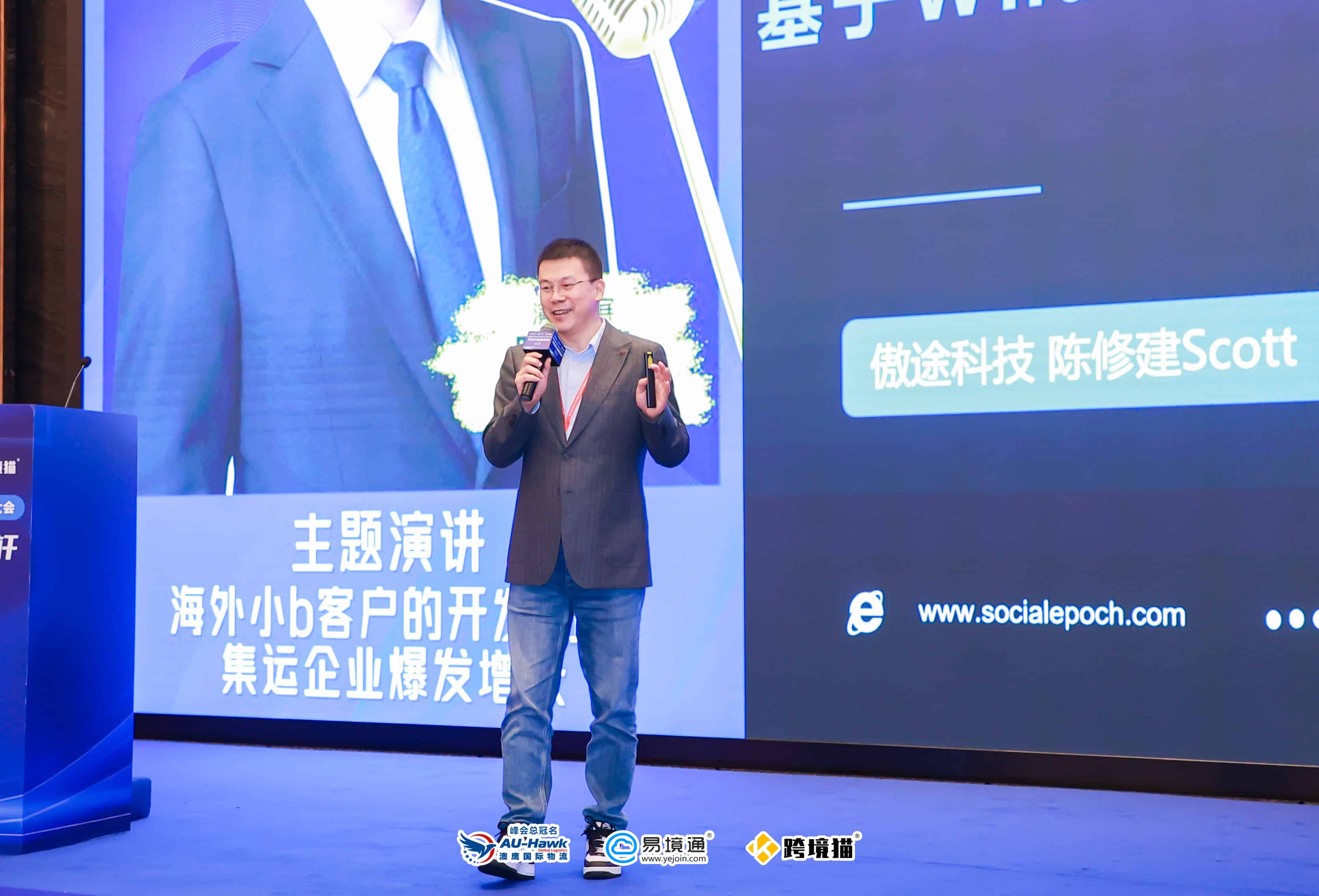 在峰會上,傲途科技CEO陳修建Scott作為特邀嘉賓亮相出席,并發(fā)表主題《海外小b客戶的開發(fā)助力集運(yùn)企業(yè)爆發(fā)增長》精彩的演講,陳總從海外分銷小B的開發(fā)這一創(chuàng)新增長視角出發(fā),指出社交媒體矩陣運(yùn)營、Google地圖搜索小B、廣告投放等手段是推動集運(yùn)企業(yè)私域運(yùn)營增長的關(guān)鍵。
