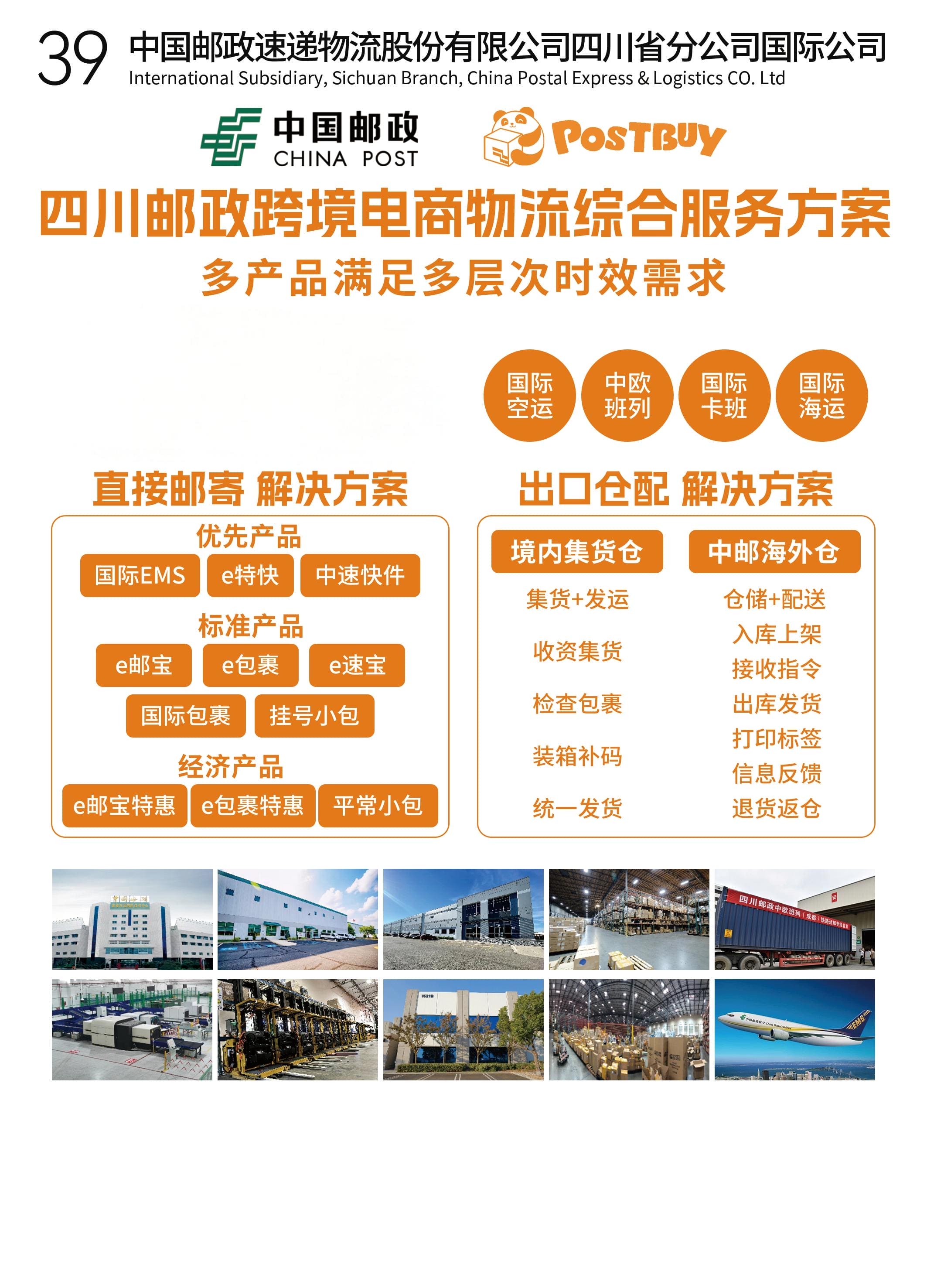 中國郵政集團(tuán)四川省分公司國際公司的跨境電商物流綜合服務(wù)方案,涵蓋多個(gè)產(chǎn)品層次,能滿足不同客戶的時(shí)效需求。直接郵寄解決方案包括優(yōu)先產(chǎn)品如國際 EMS、e 特快、中速快件;標(biāo)準(zhǔn)產(chǎn)品 e 郵寶、e 包裹、e 速寶、國際包裹、掛號小包;經(jīng)濟(jì)產(chǎn)品有平常小包、e 郵寶特惠、e 包裹特惠。此外,四川郵政還提供出口倉配解決方案,包括境內(nèi)集貨倉和中郵海外倉服務(wù),以及國際空運(yùn)、中歐班列、國際卡班和國際海運(yùn)等國際貨運(yùn)解決方案,全方位保障貨物的安全、高效運(yùn)輸。