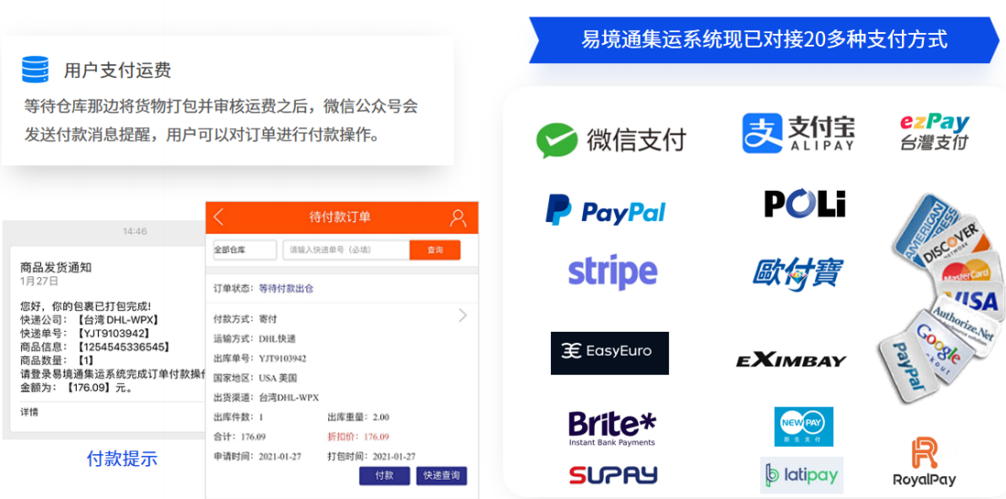 隨著企業(yè)業(yè)務(wù)量逐步上升和團隊規(guī)模擴大,對系統(tǒng)的功能深度和穩(wěn)定性提出更高要求。易境通集運系統(tǒng)為成長型企業(yè)提供了更加靈活和強大的功能支持。例如,在運費計算方面,系統(tǒng)能夠結(jié)合多種因素生成差異化方案,協(xié)助企業(yè)平衡成本、時效與可靠性,提升客戶滿意度。此外,系統(tǒng)集成了多種主流的支付接口,方便企業(yè)快速回籠資金,也提升了用戶的付款體驗。